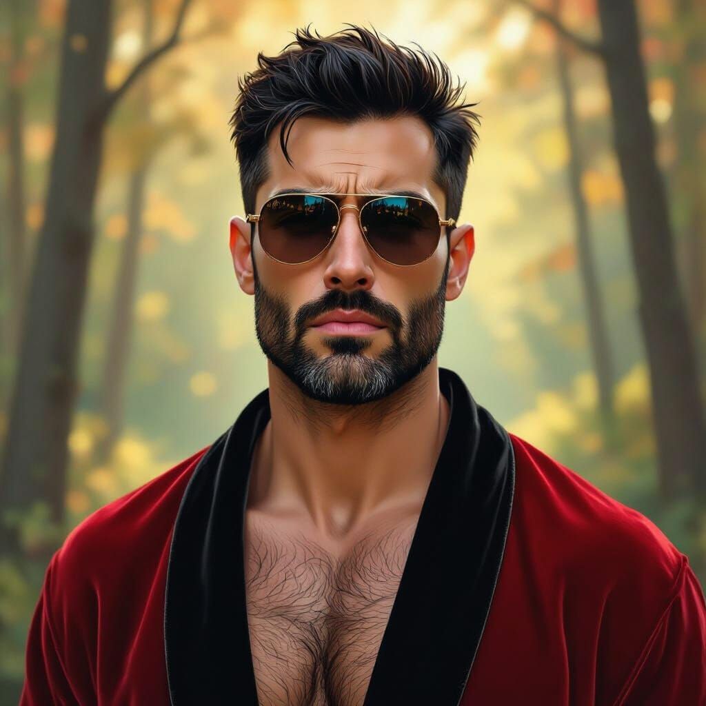 A striking picture of a man with a hairy chest wearing sunglasses and a red robe in a forest. The portrait is rendered in an impressionistic style with vibrant colors and dynamic lighting.
