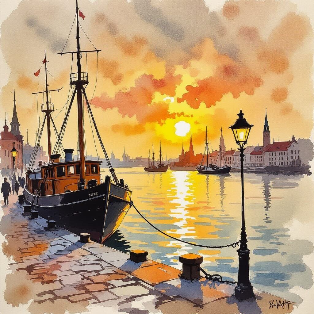 A somber image of a harbor in autumn, showing remnants of the past. Rendered as a watercolor painting with orange, brown, gold, and rust-colored hues.