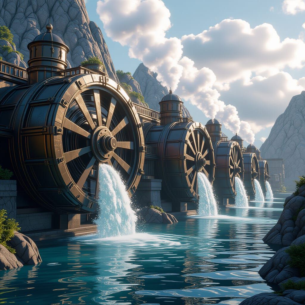 This image showcases intricate water powered turbines in a fantastical, detailed matte painting style. Features deep, complementary colors and 8k resolution, trending on Artstation.