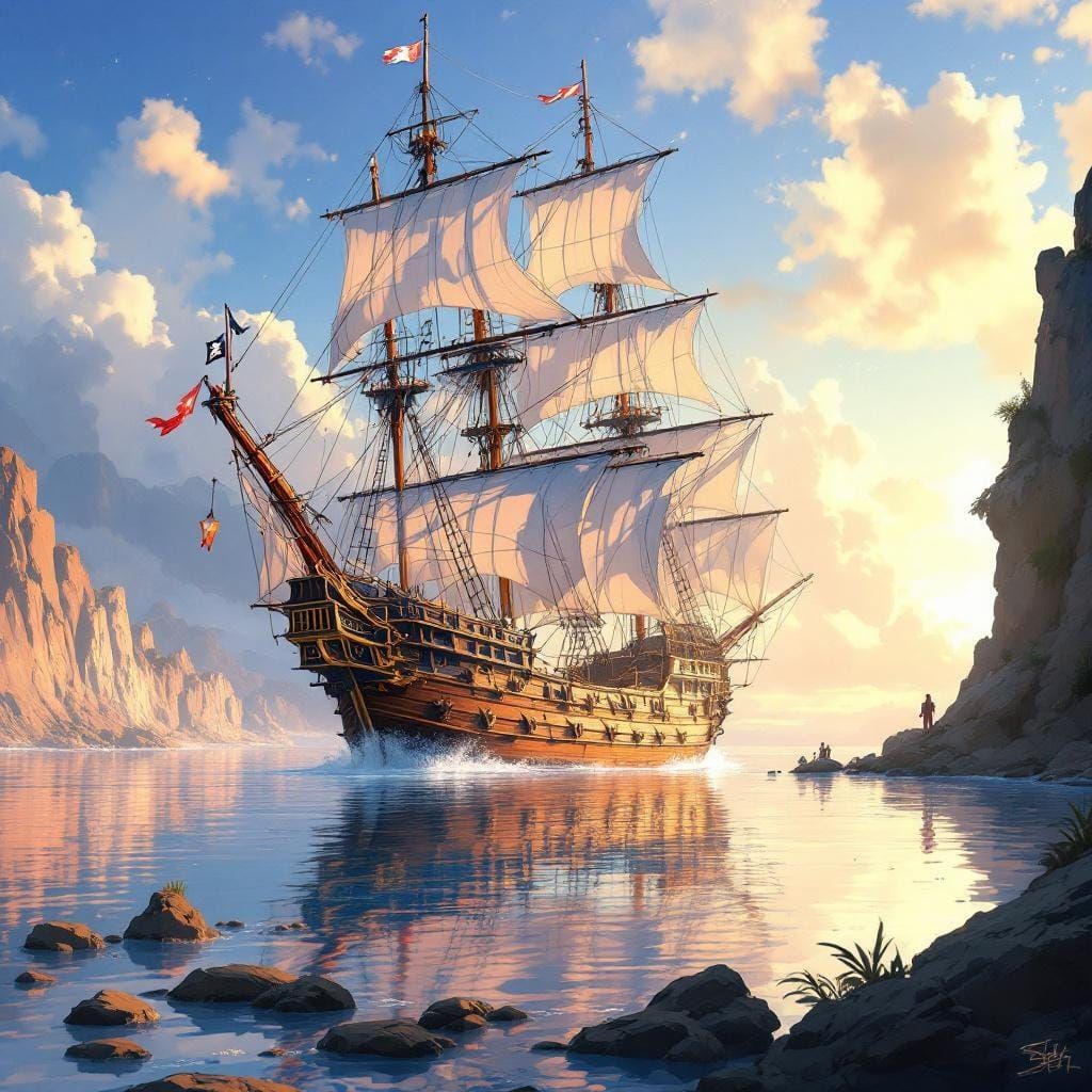 A vibrant image of a pirate ship with white and blue sails in a tranquil bay, bathed in warm morning light. The scene is rendered in a painterly anime style.
