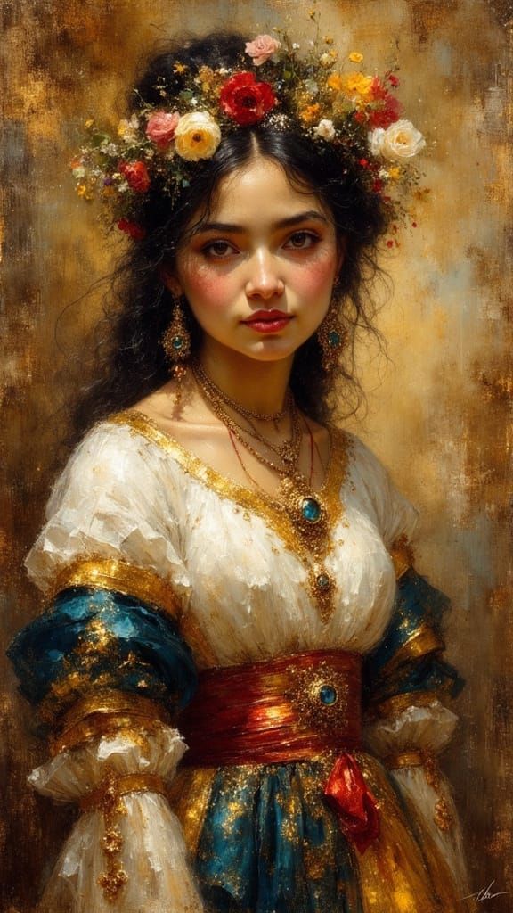 A striking picture of a beautiful indigenous Colombian woman in the style of an early 19th-century portrait. The image evokes a sense of history and cultural richness.