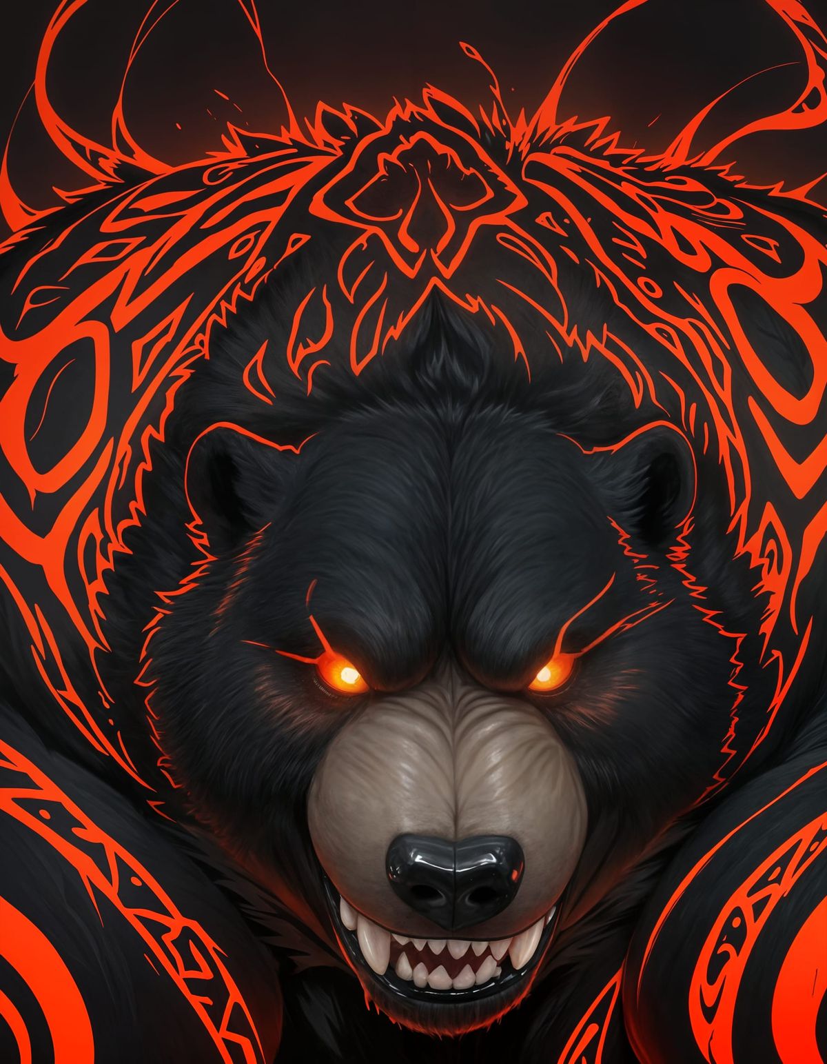 This image depicts a massive, morbidly obese black bear with a scowling expression and glowing red voodoo eyes, surrounded by tribal markings and adorned with sharp teeth and red tattoos.