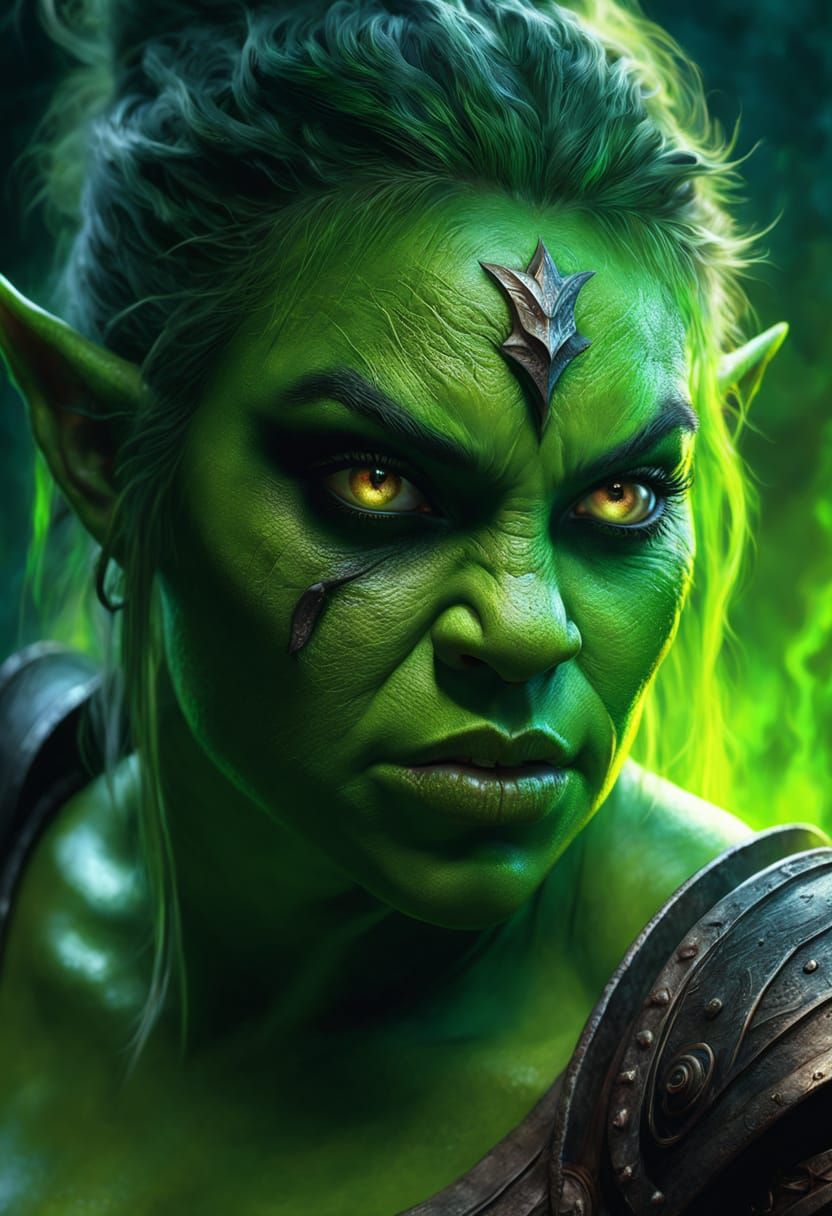A striking picture of a beautiful ogre woman looking at the viewer. The digital painting features realistic textures, dramatic lighting, and vibrant colors in an atmospheric style.