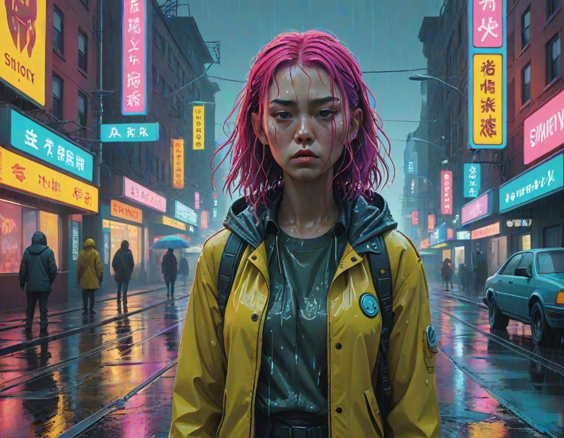 This image shows a serene woman standing in a rain-slicked cityscape. The digital art features neon lights, vibrant colors, and cel-shaded textures in a postmodern, futuristic style.
