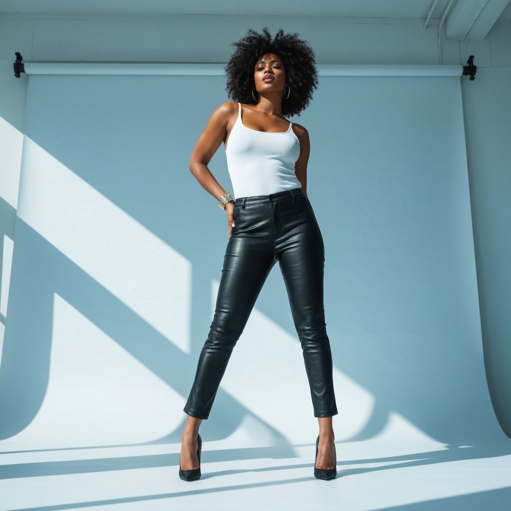 This image shows a curvy African woman in a green silk shirt and red latex skirt, posed in a vintage office. The piece is reminiscent of 80s retro art, with a hyperrealistic aesthetic.