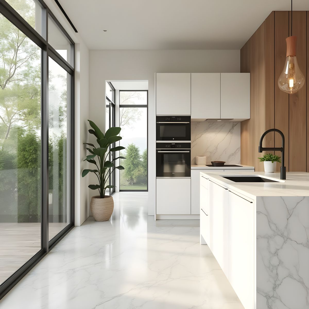 A modern kitchen interior featuring minimalist, Scandinavian design bathed in natural light. The image showcases white marble, wood textures, indoor plants, and clean surfaces as 3D rendered digital art.
