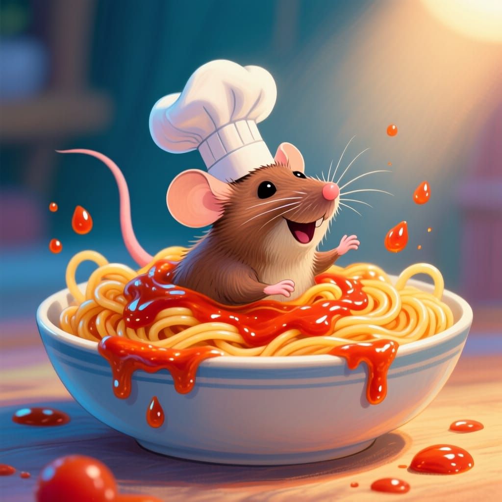 This charming digital artwork depicts a small rat wearing a chef's hat, happily swimming in a bowl of spaghetti. Rendered in vibrant colors with a warm glow, it evokes a whimsical storybook style.