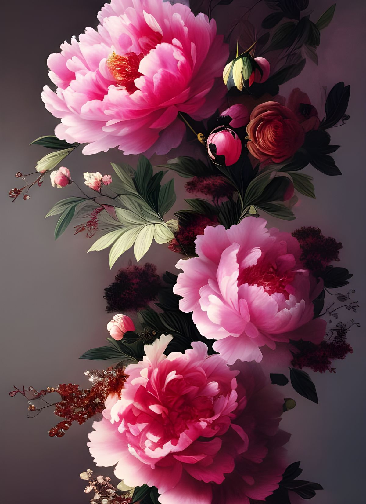 This image shows a detailed rendering of a peony flower. The artwork features intricate details, deep pastel colors, dramatic lighting, and atmospheric effects, reminiscent of classical botanical art.