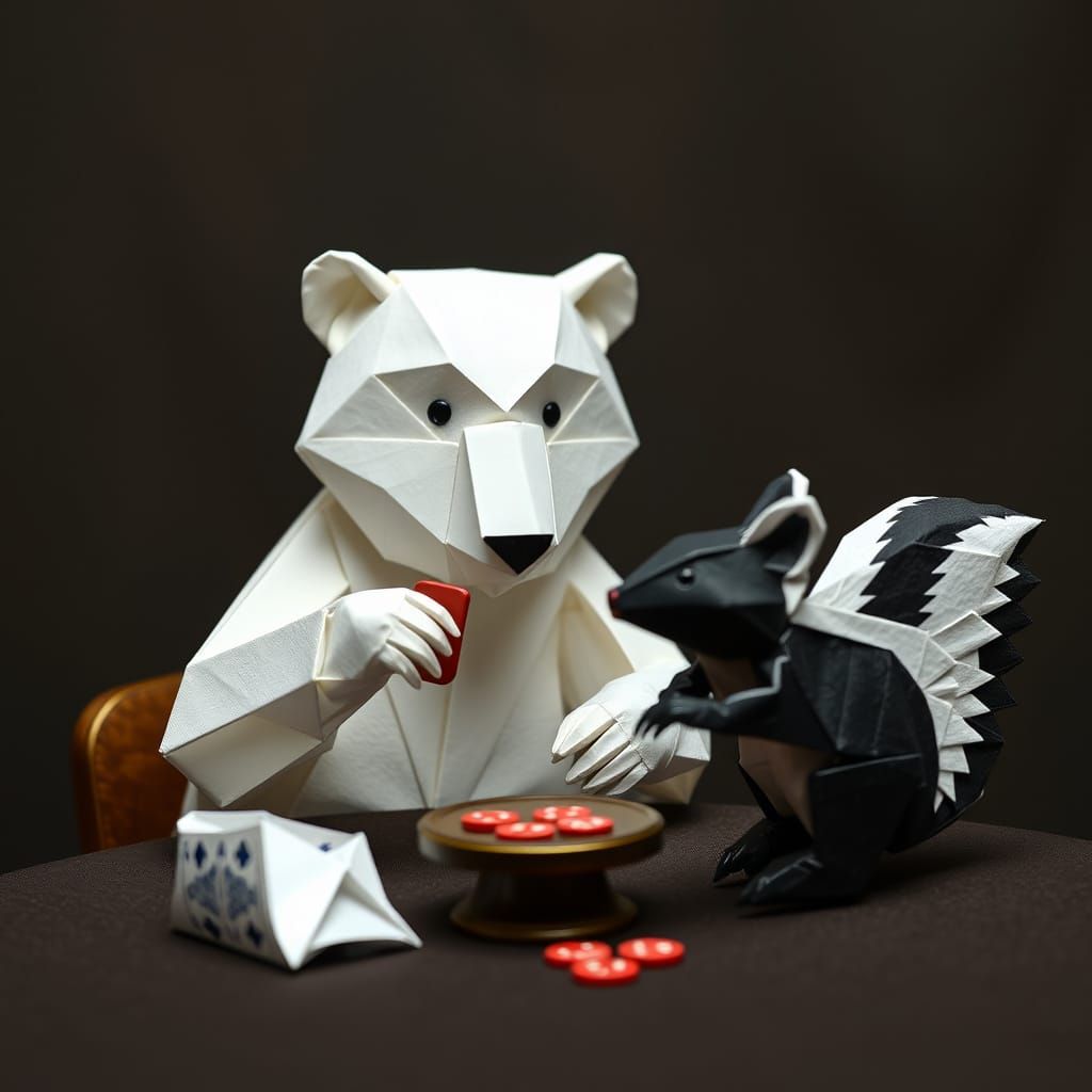 This image depicts a whimsical scene of an origami polar bear and an origami skunk playing poker together, showcasing intricate paper artistry.