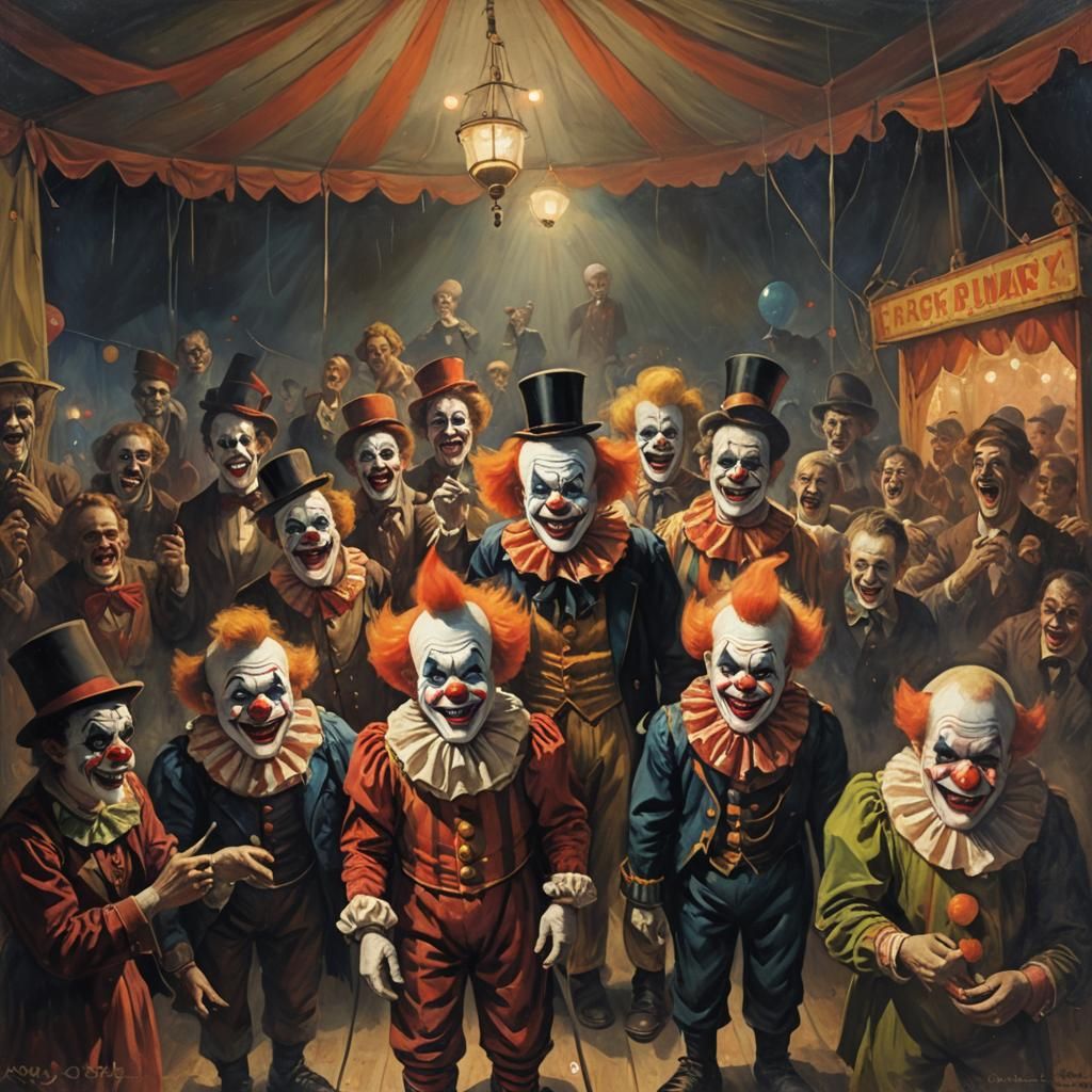 A vintage circus poster featuring spooky clowns under eerie lighting. The oil painting style evokes a sense of classic, slightly unsettling, circus nostalgia.