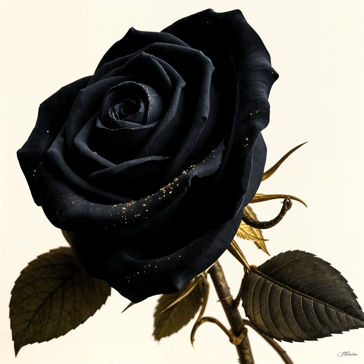 A beautiful, intricate black rose with delicate patterns, shimmering sparkles, and ornate details, set against a soft background, evoking a sense of mystical elegance and romance.