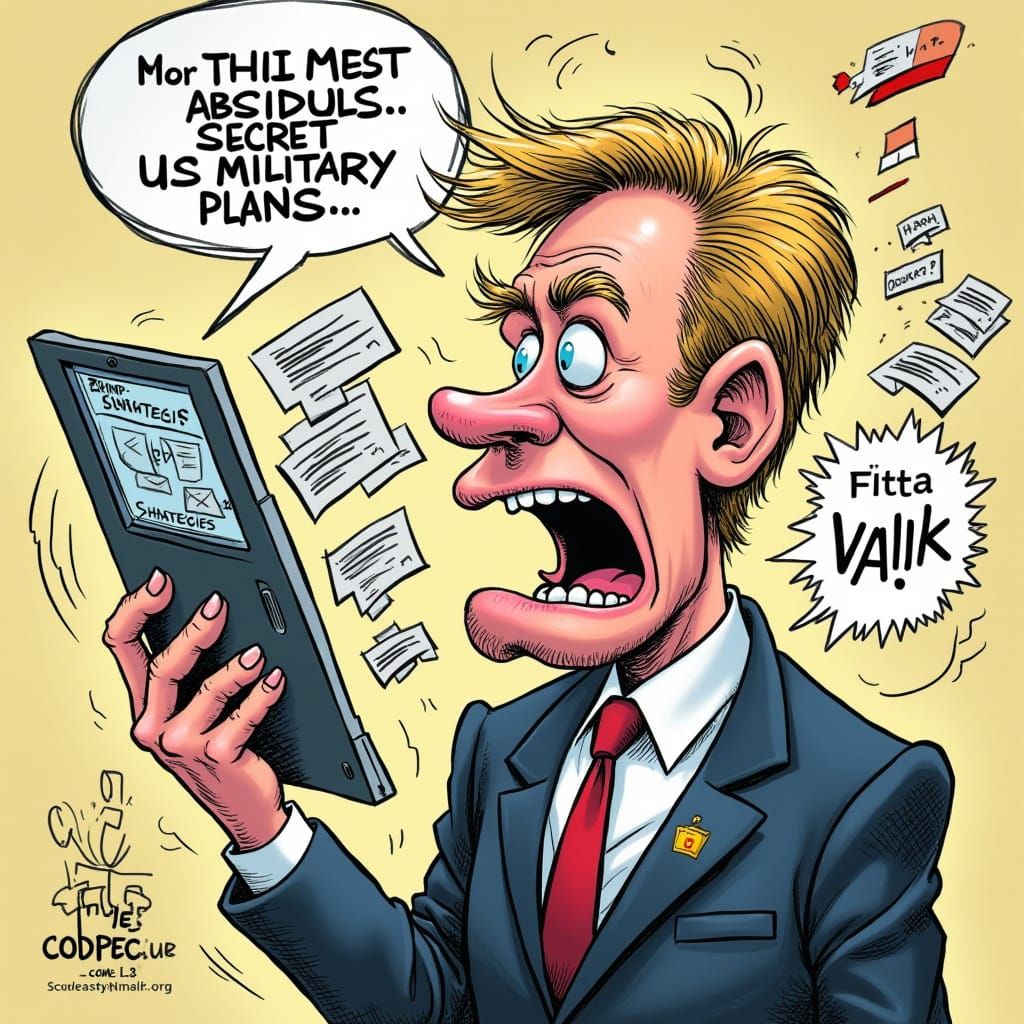 This satirical illustration depicts a chaotic scene of a government official holding a tablet with a group chat screen displaying absurd, confidential US military plans. The artwork combines bold lines, vibrant colors, and exaggerated expressions, reminiscent of classic editorial cartoons with a hint of ...