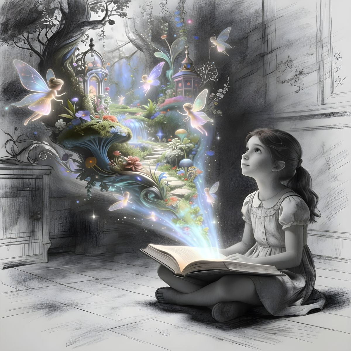 This image shows a pencil sketch of a girl reading, with a vibrant 3D pixie world emerging from her book. Hyper-detailed and realistic 3D cinematic art.