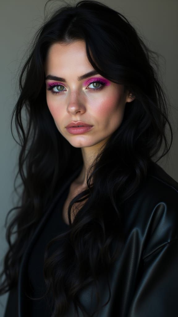 A digital painting portrays a modern gothic witch in an urban setting. She wears a leather jacket and long black dress, accentuated by dramatic makeup and neon lights, creating a mystical atmosphere in a cyberpunk aesthetic.