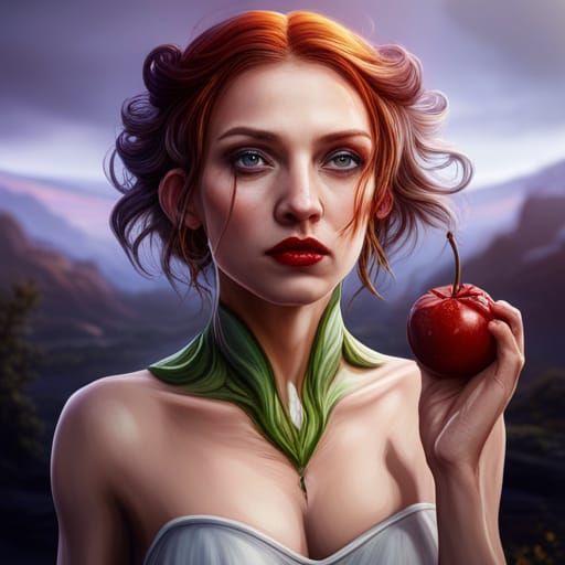 A striking portrait of a woman with a deep connection to food, rendered with intricate detail. The image features complementary colors and a fantastical concept art style in 8k resolution.