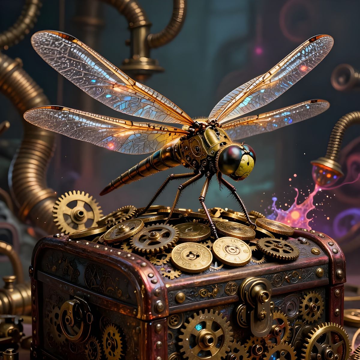 This hyperrealistic image showcases a detailed steampunk dragonfly perched on a treasure chest. Features intricate detail, vibrant colors, and dramatic lighting.