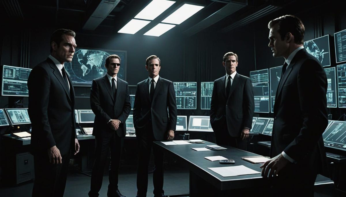 This image depicts a dystopian broadcast studio where alien news anchors, disguised as humans, disseminate propaganda. The scene, rendered in a cyber-noir style, features surveillance drones and shadowy figures.