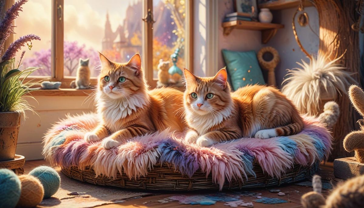 This image shows cats exploring a magical fantasy world filled with scratching posts and beds. The scene is rendered in a vibrant, dreamlike watercolor style with soft textures and pastel colors.