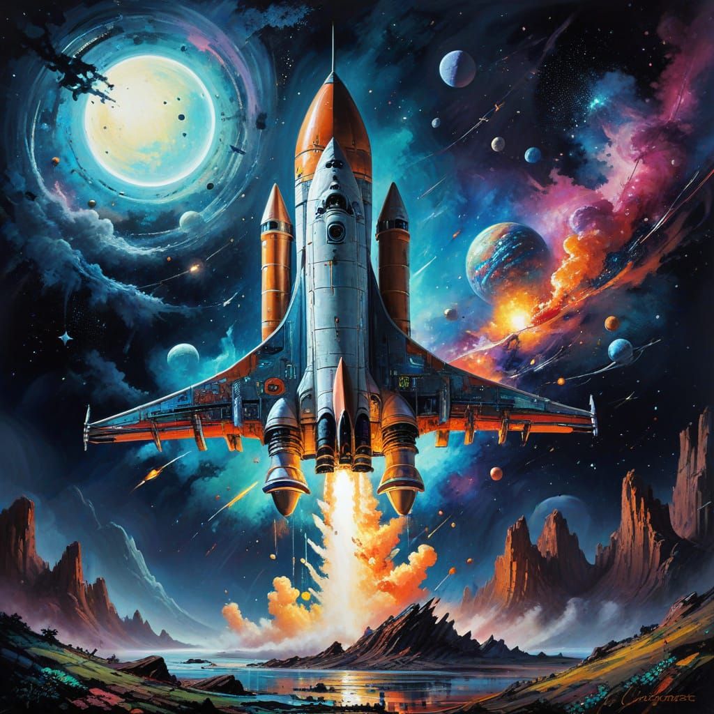 A gouache painting of a rocket ship launching into a starry, colorful sky. The artwork evokes a dreamy atmosphere and suggests a retro, futuristic style.