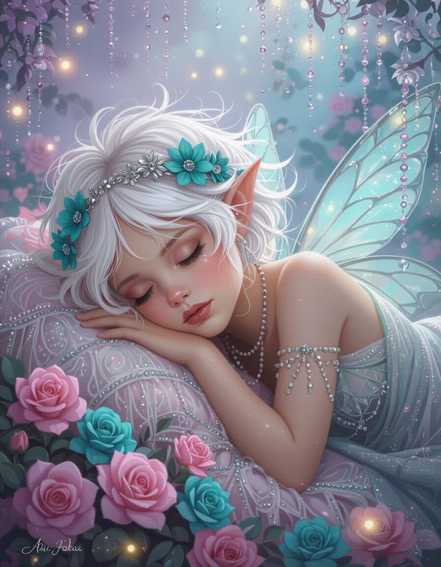 This highly detailed fantasy art depicts a sleeping pixie with white hair on a bed of flowers, covered by a beaded blanket. Surrounded by twinkling lights and misty hues, it has an ethereal, luminous quality.