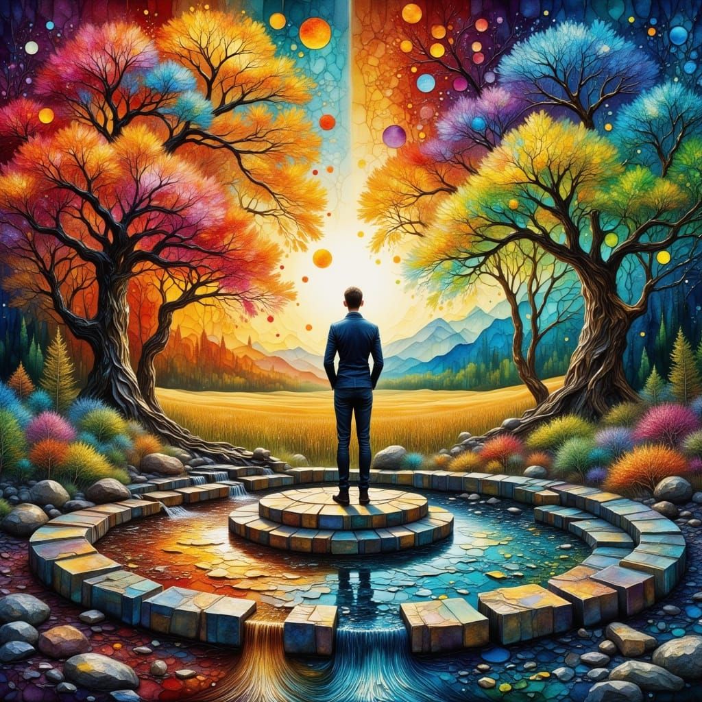 This image shows a man on a stone platform amidst four distinct seasons. Spring blooms with flowers, summer offers wheat fields, autumn displays fiery foliage, and winter has falling snowflakes, all divided by a flowing river, rendered as an impasto painting.