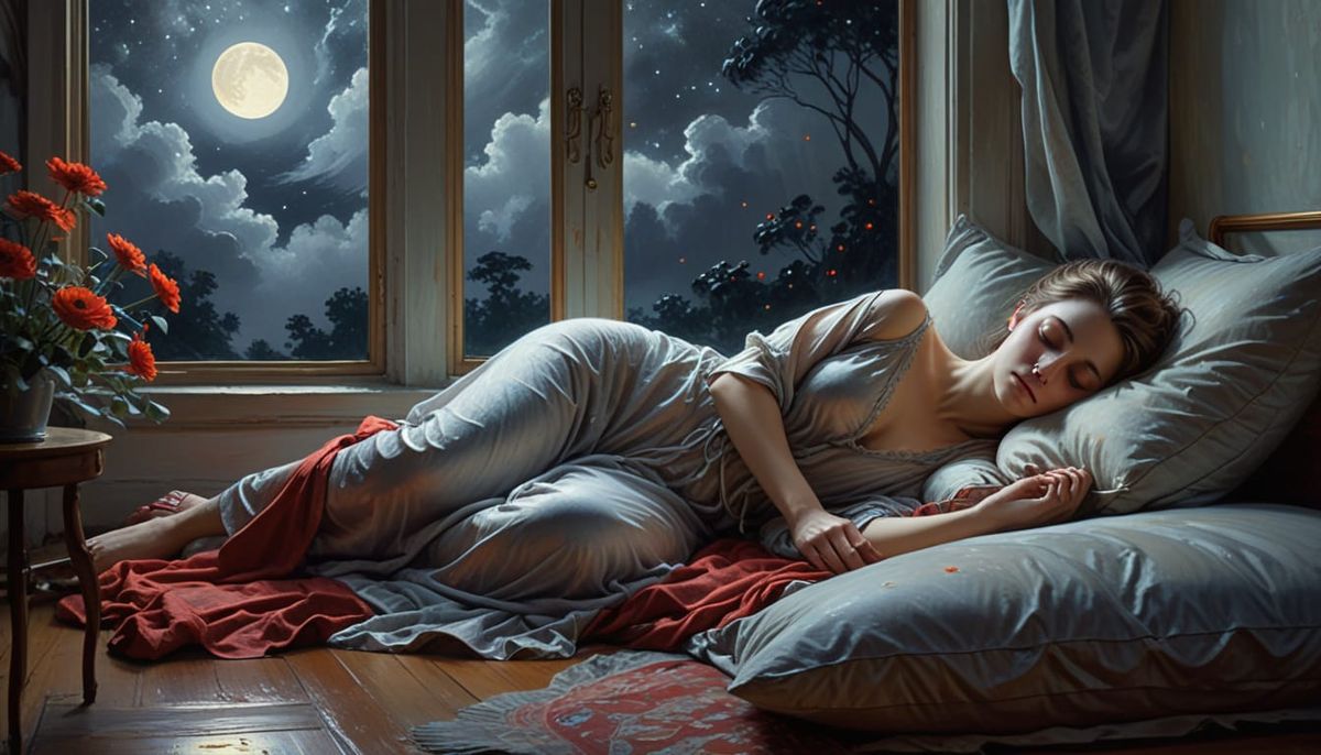 This image depicts a woman sleeping peacefully on pillows in a dimly lit room, illuminated by gentle moonlight. Rendered as an impressionistic oil painting with soft shadows and an elegant, tranquil atmosphere.