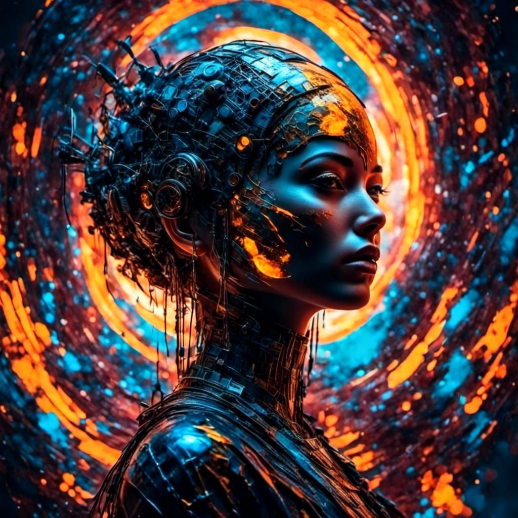 A dramatic image of a cosmic eye with swirling, glowing colors and cybernetic enhancements. The artwork is rendered with dark, moody lighting and a vibrant, high-contrast cyberpunk aesthetic.
