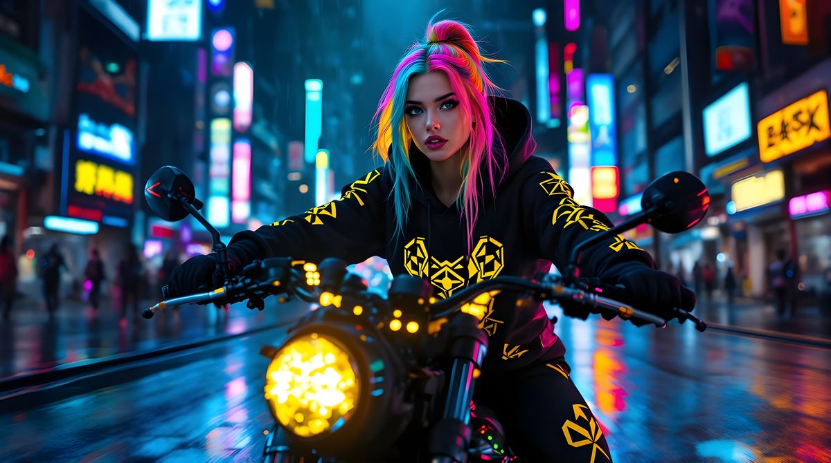 This image shows a young woman with vibrant, multi-colored hair riding a motorcycle through a neon city at night. The scene is rendered in a cyberpunk aesthetic.