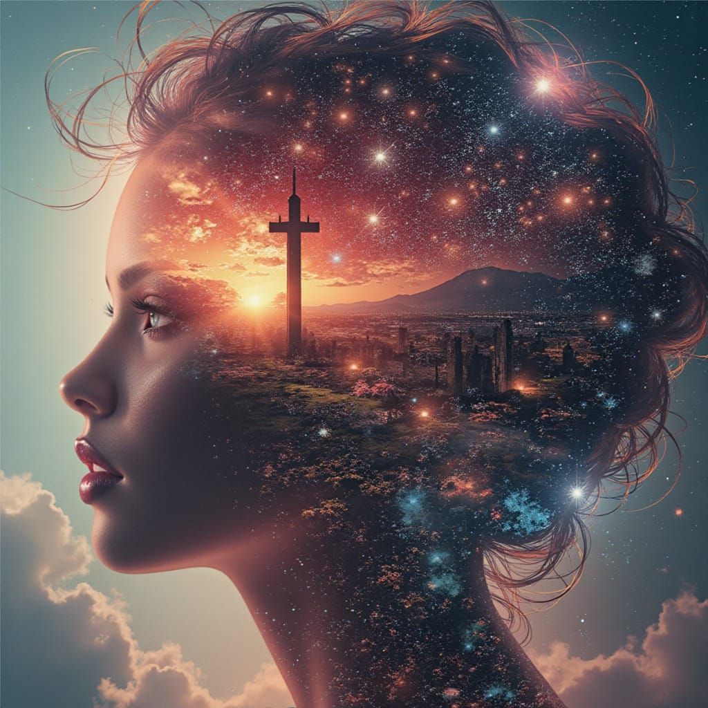 This image shows a woman's transparent head filled with a sci-fi kingdom and galaxies. The scenes inside depict epic journeys, sunsets, and cyberpunk life, rendered as a multiple exposure digital art movie poster.