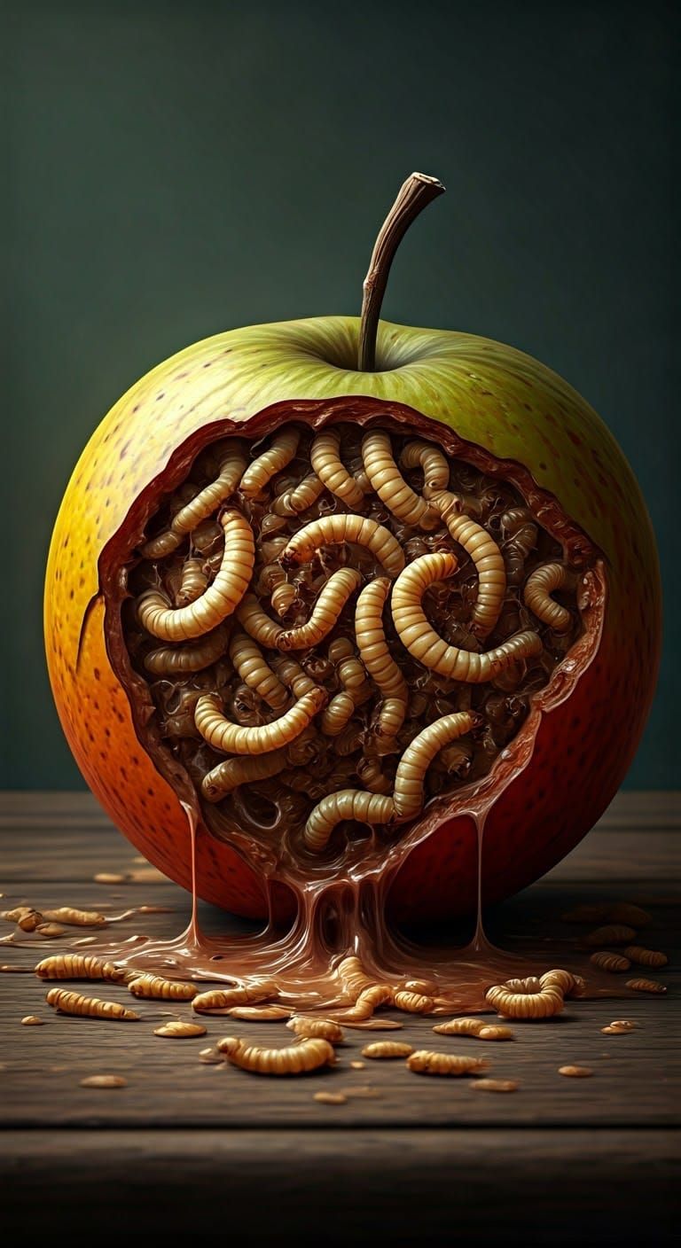 This unsettling still life features a rotting fruit with maggots undergoing a twisted metamorphosis, set against a polished background in a gothic, Victorian-era aesthetic with muted, tetradic harmonies.