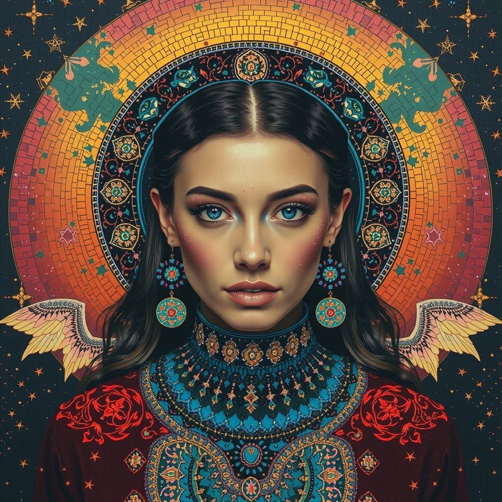 This image shows a mosaic artwork of a photorealistic woman with iridescent colors. The mosaic comprises tiny, colorful tiles set against a backdrop of a starry night sky in a maximalist style.