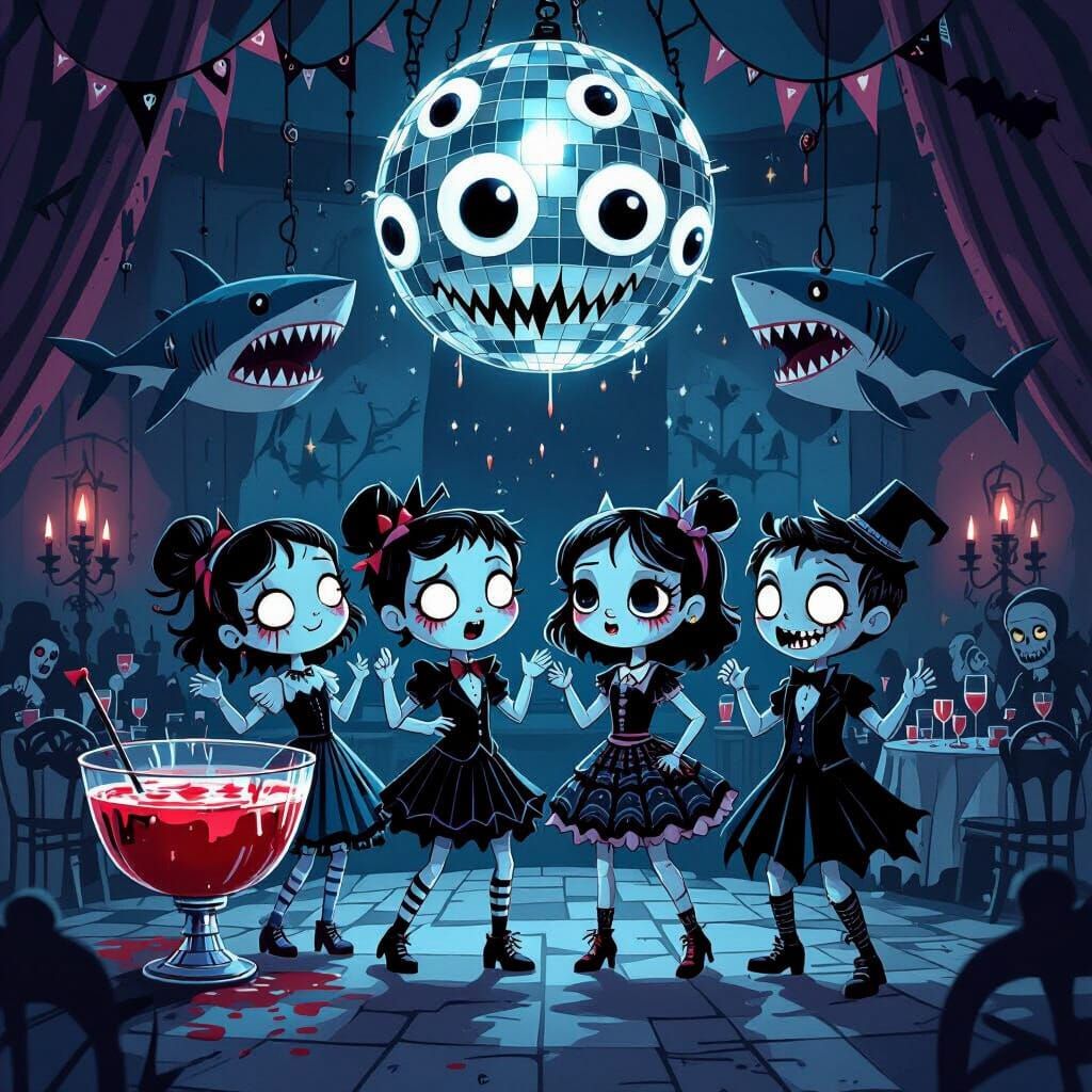 This image shows cute undead teenagers dancing at a gothic prom. Features include a ballroom, eerie decorations, and a disco ball made of eyes, rendered in a moody gothic fantasy illustration style.