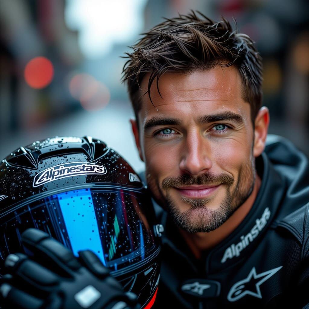 This image shows a motorcyclist with blue eyes and short black hair smiling warmly in the rain. The photorealistic close-up features a sleek motorcycle jacket and helmet, with rich reflections and sharp textures.