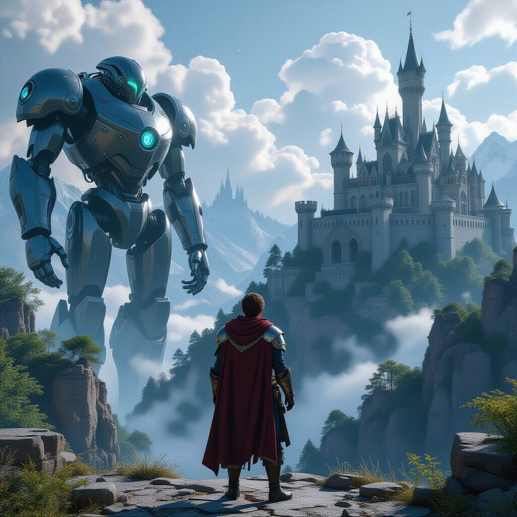 This image depicts a medieval warrior at a cliff edge, symbolizing the clash between a futuristic robotic world and a traditional medieval realm. Rendered in a detailed 3D anime style with cinematic lighting.
