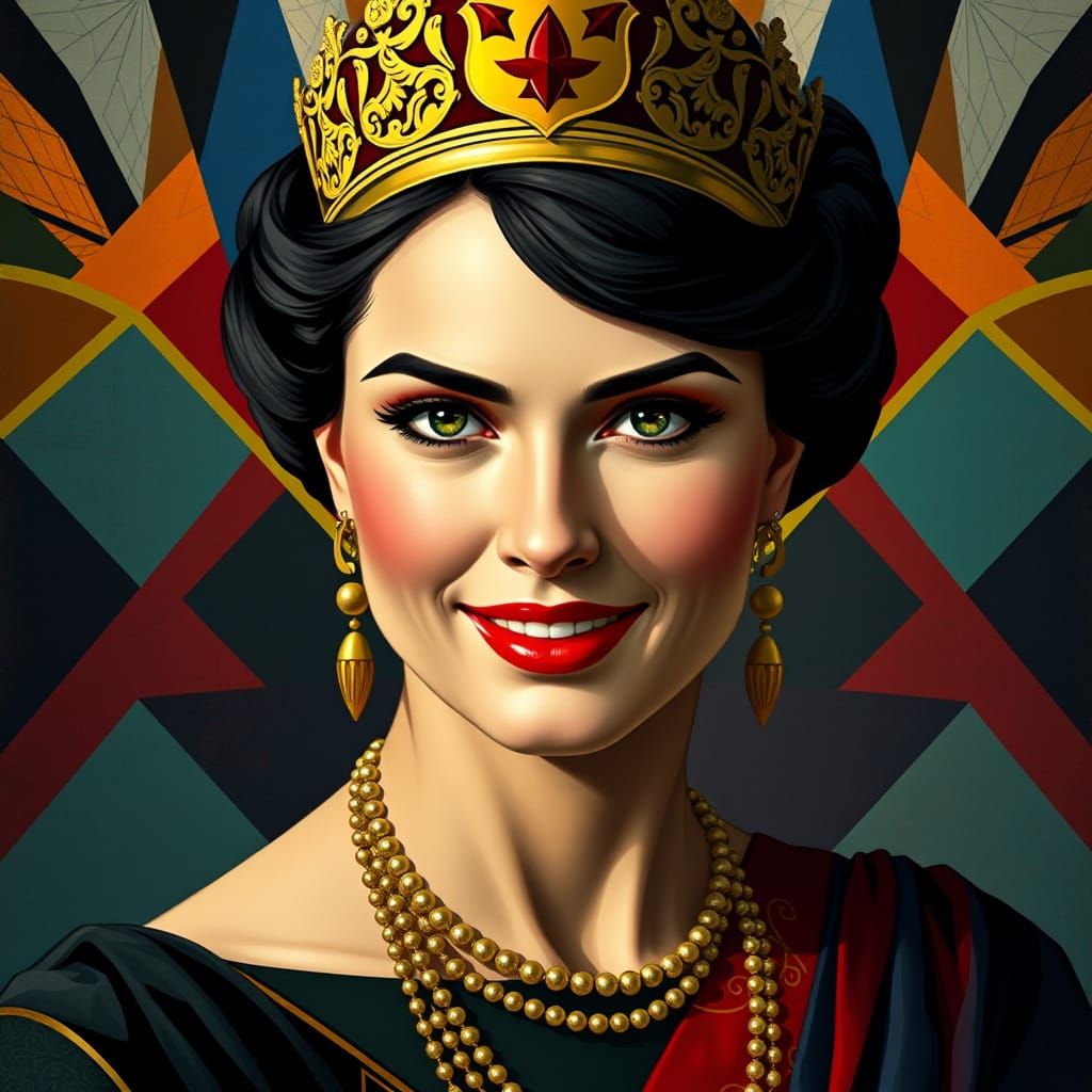A portrait of a wise woman with an enigmatic smile, set against a vibrant cubist art deco background with geometric vectors and bold fauvist hues, blending traditional and modern techniques.