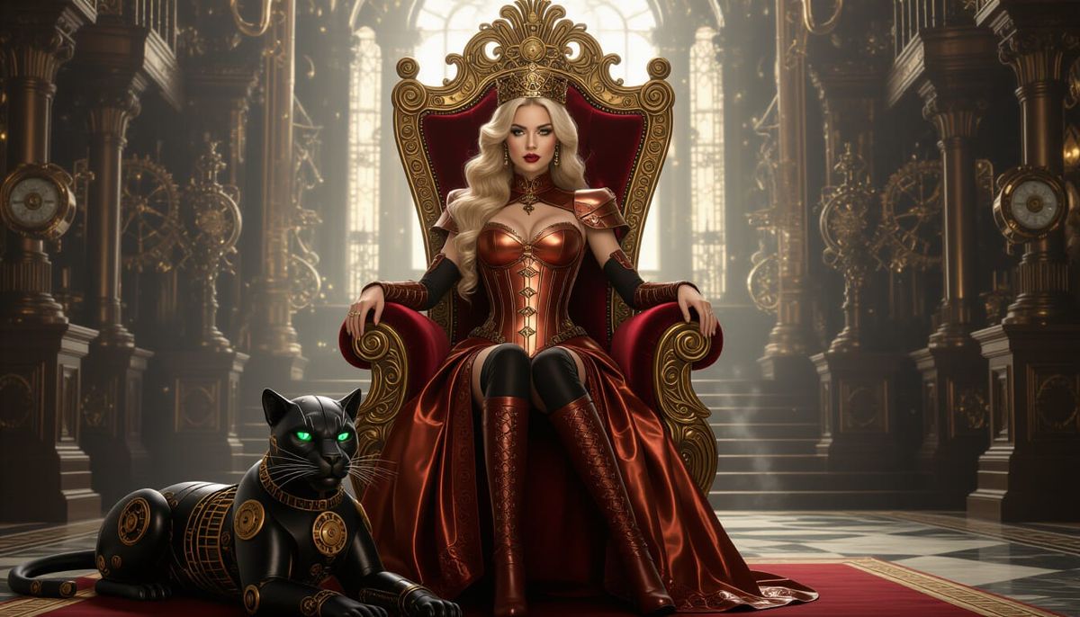 A grand steampunk throne room, where a regal queen sits atop an ornate throne of polished brass and velvet. Her attire blends imperial elegance with steampunk flair, copper corset laced with bronze, a crown of gears, and thigh-high boots of gleaming black leather. Her dark blonde hair flows down her back. At her feet lounges a steampunk panther, its sleek form crafted from blackened steel, with steam hissing from its joints and emerald eyes glowing with mechanical life. Craft a prompt where she rules with a steely gaze, her panther purring with the clank of pistons, as the air hums with the power of her industrial empire!