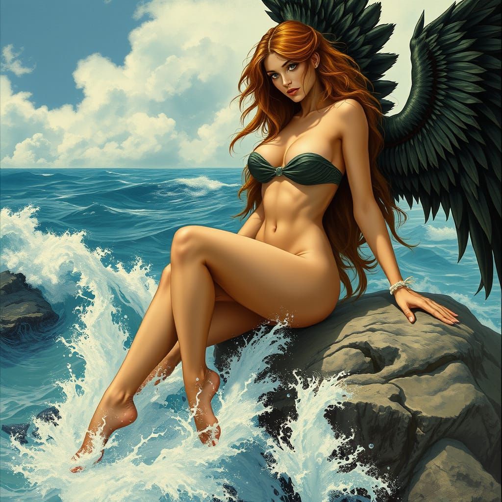 This image shows Valasca, a harpy queen from Greek mythology, standing on a cliff. The woman has long, wild hair, piercing eyes, and an athletic figure, depicted with realistic details.