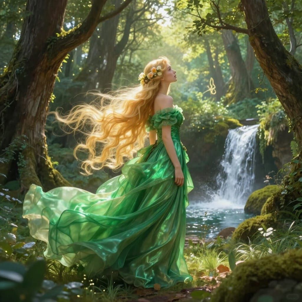 This image shows a regal princess with flowing golden hair and an emerald gown in a sun-dappled enchanted forest. Rendered in a romantic, ethereal fantasy art style with soft, glowing light.