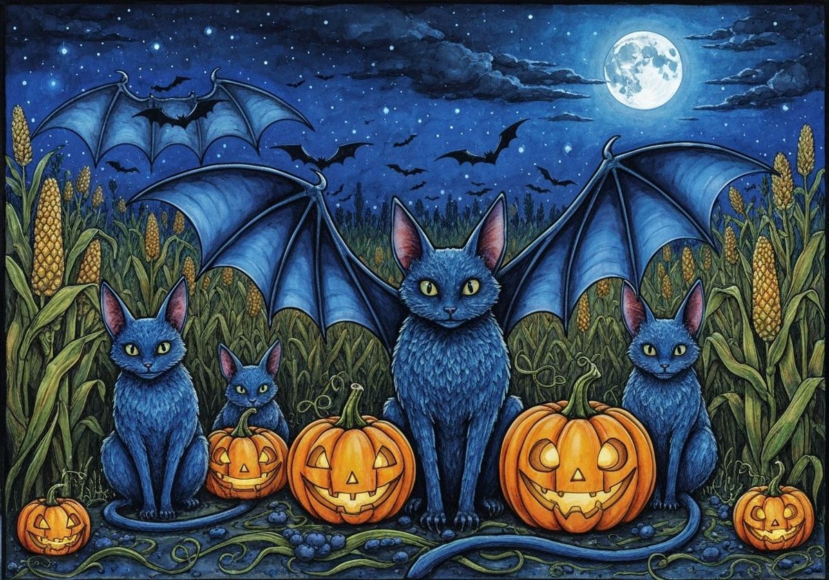 Make your own Zentangle Bat-kitties with pumpkins! Free, easy AI art generation for fantasy illustrations.