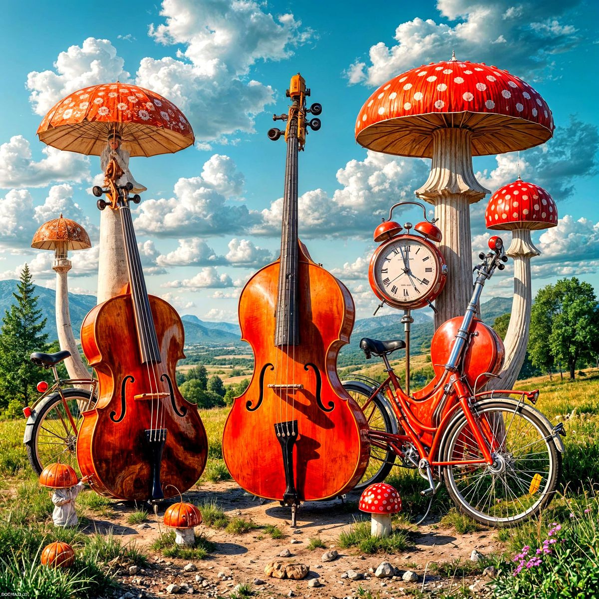 This image presents a surreal and photorealistic composition featuring musical instruments, bicycles, clocks, and fantastical mushrooms in a stunning landscape, influenced by masters of surrealism and hyperrealism.