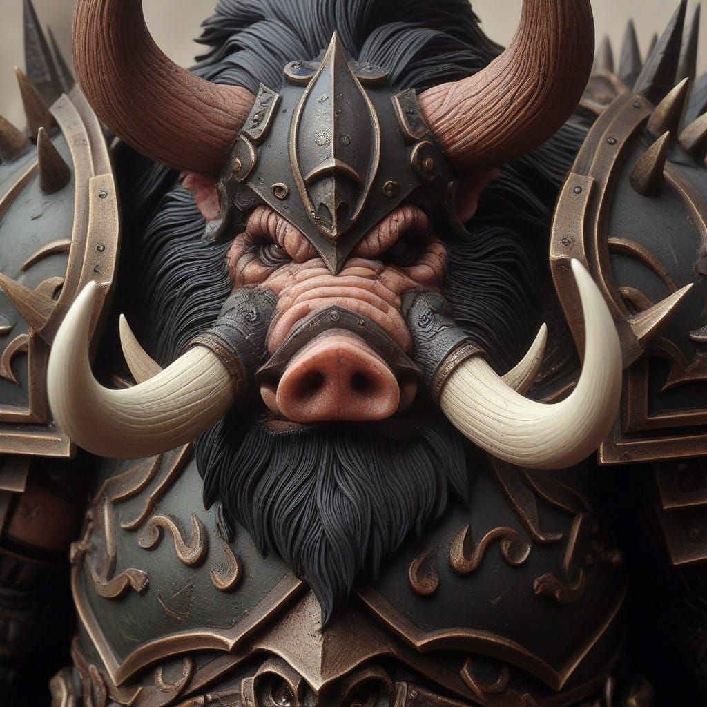 This image shows a formidable, heavily armored pig knight in obsidian armor, reminiscent of a character from the Mythic Legions universe. The artwork features detailed textures and imposing scale.