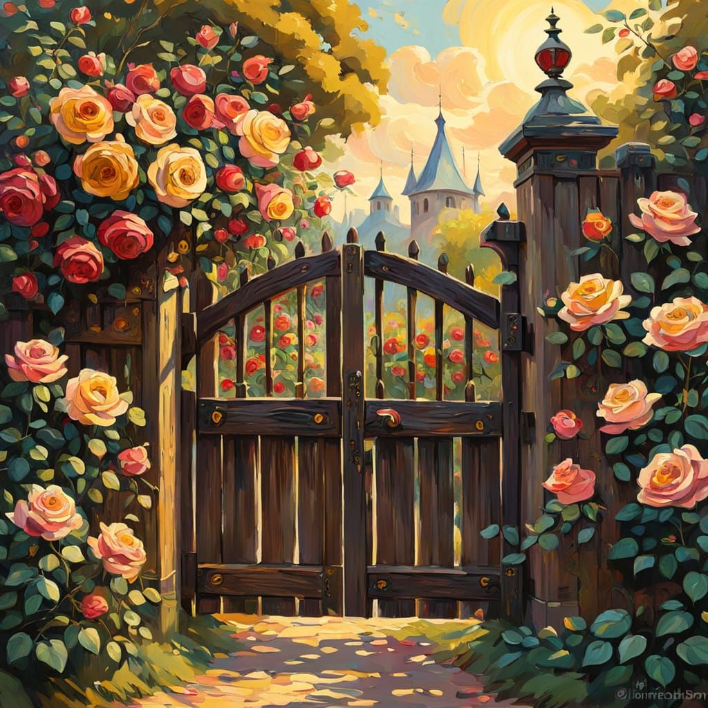 A striking picture of a wooden gate adorned with vibrant roses. The artwork uses thick brush strokes and impasto techniques, reminiscent of early 20th-century art, to create a textured, museum-quality piece.