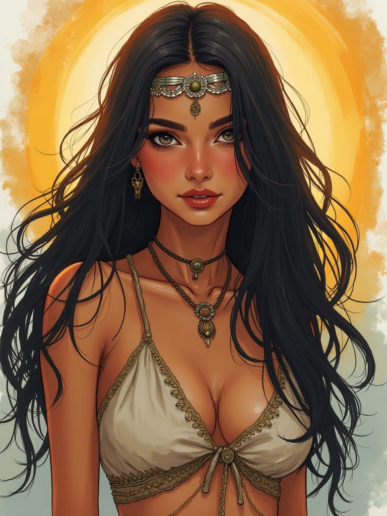 This image features a charming Native American woman with long hair and striking, luminous eyes. Rendered in a style reminiscent of adult comics, with acrylic and watercolor textures.