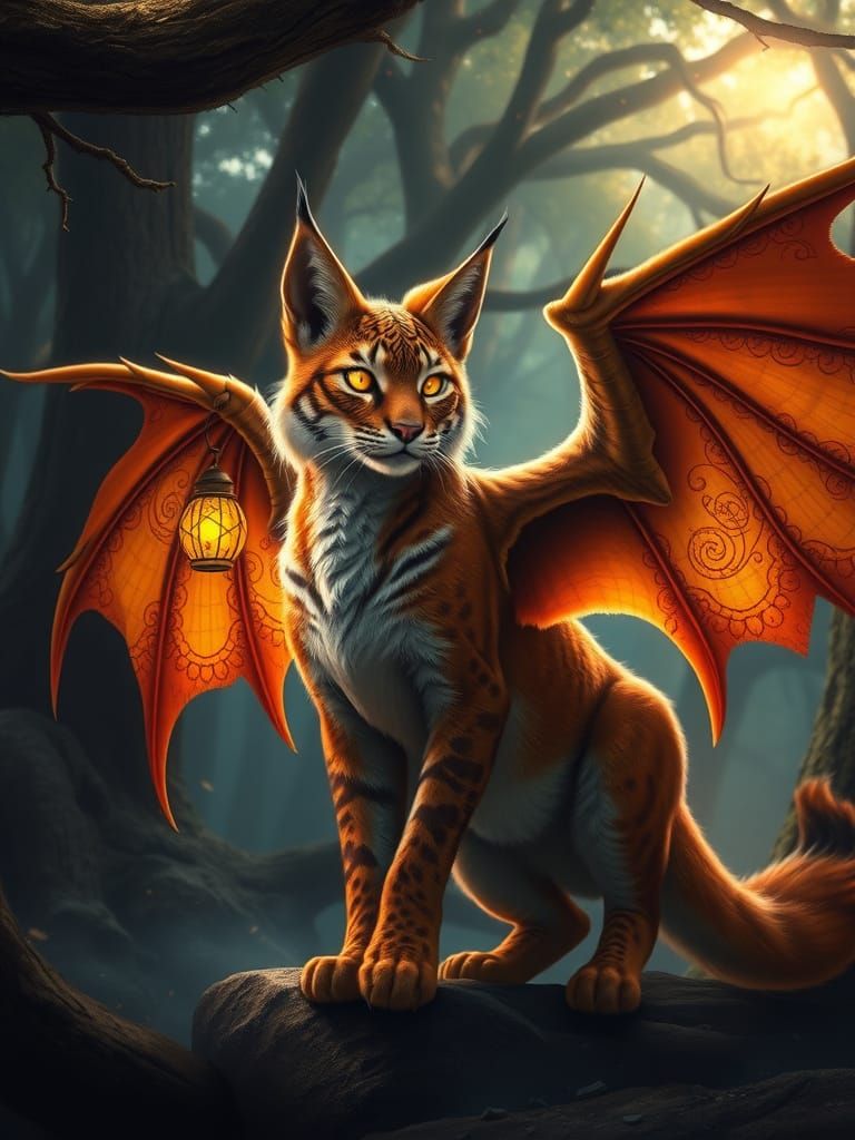 This image depicts a stunning, fantasy creature with the body of a lynx and the wings of a dragon, set against a mystical forest backdrop. The creature's warm, orange and brown fur is intricately textured, with glowing eyes and delicate, swirling patterns on its wings, evoking a sense of wonder and awe.
