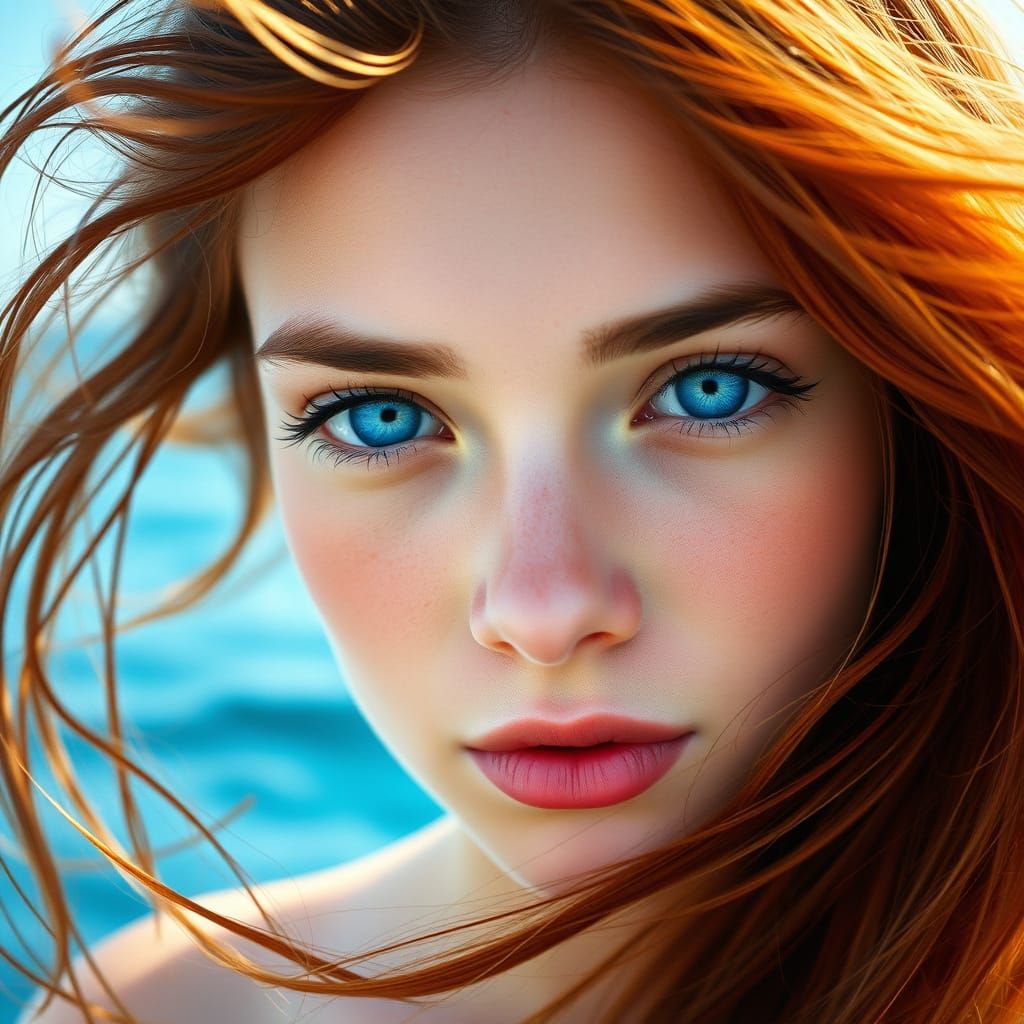 This image shows a beautiful, free-spirited woman embodying the essence of the ocean, with a wild and vibrant aesthetic reminiscent of impressionist art.
