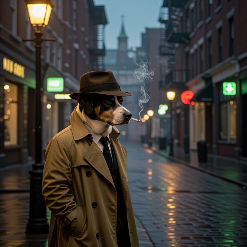 This image shows a canine detective in a trench coat and fedora on a gaslit street corner, smoking a cigarette. The scene is rendered in a classic film noir aesthetic.