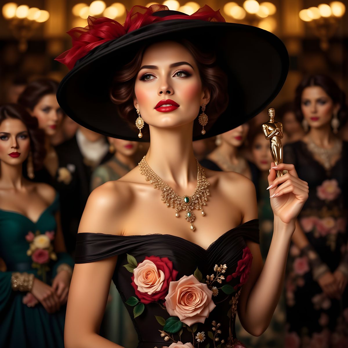 A glamorous actress accepts an Oscar award in a flowing gown and wide-brimmed hat. The scene blends art nouveau and mystical elements with soft lighting and dramatic shadows.