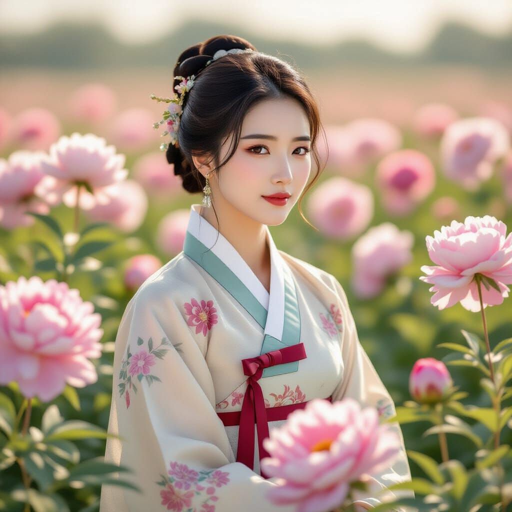 This image shows a Korean woman in a modernized hanbok standing in a field of peonies. The portrait captures a sense of timeless beauty and ethereal grace with soft, natural lighting, rendered as a hyperrealistic painting.