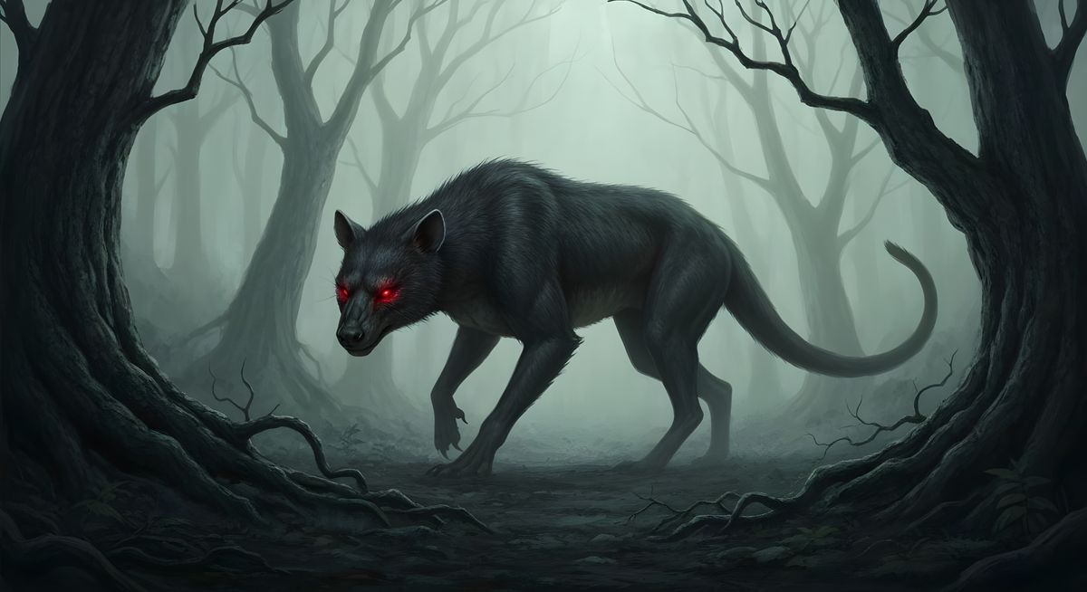 This image depicts a gothic, vampiric Thylacine with dark fur and glowing red eyes hunting in a misty, decaying forest. The scene is rendered in a dark fantasy style with dramatic lighting.