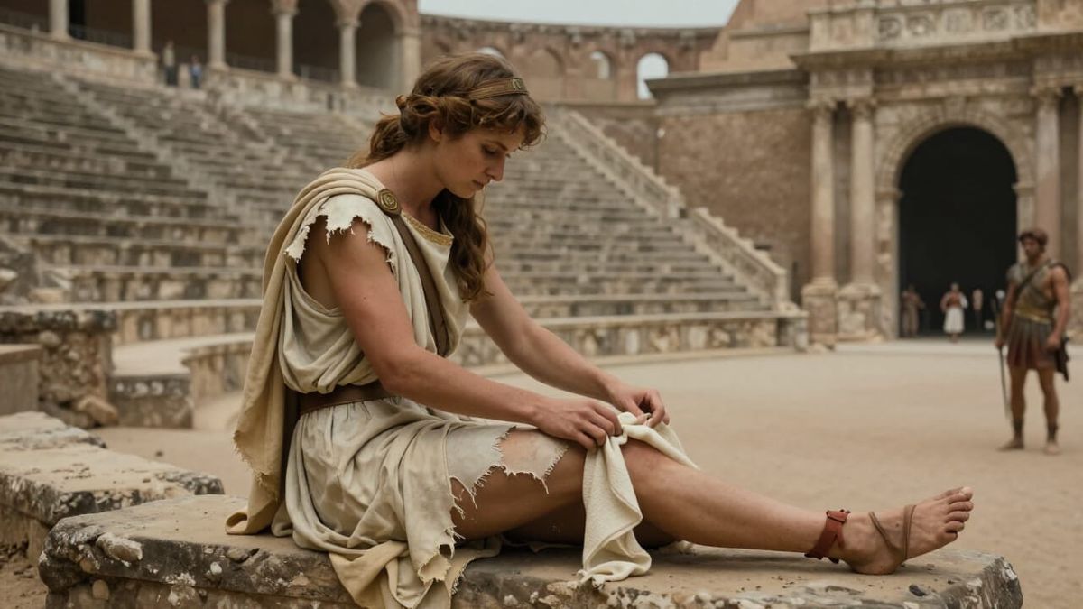 This image depicts a realistic and powerful scene of a female gladiator caring for her body after a fierce fight. Warm light highlights her muscles and the dusty arena atmosphere, rendered in an academic realism style.
